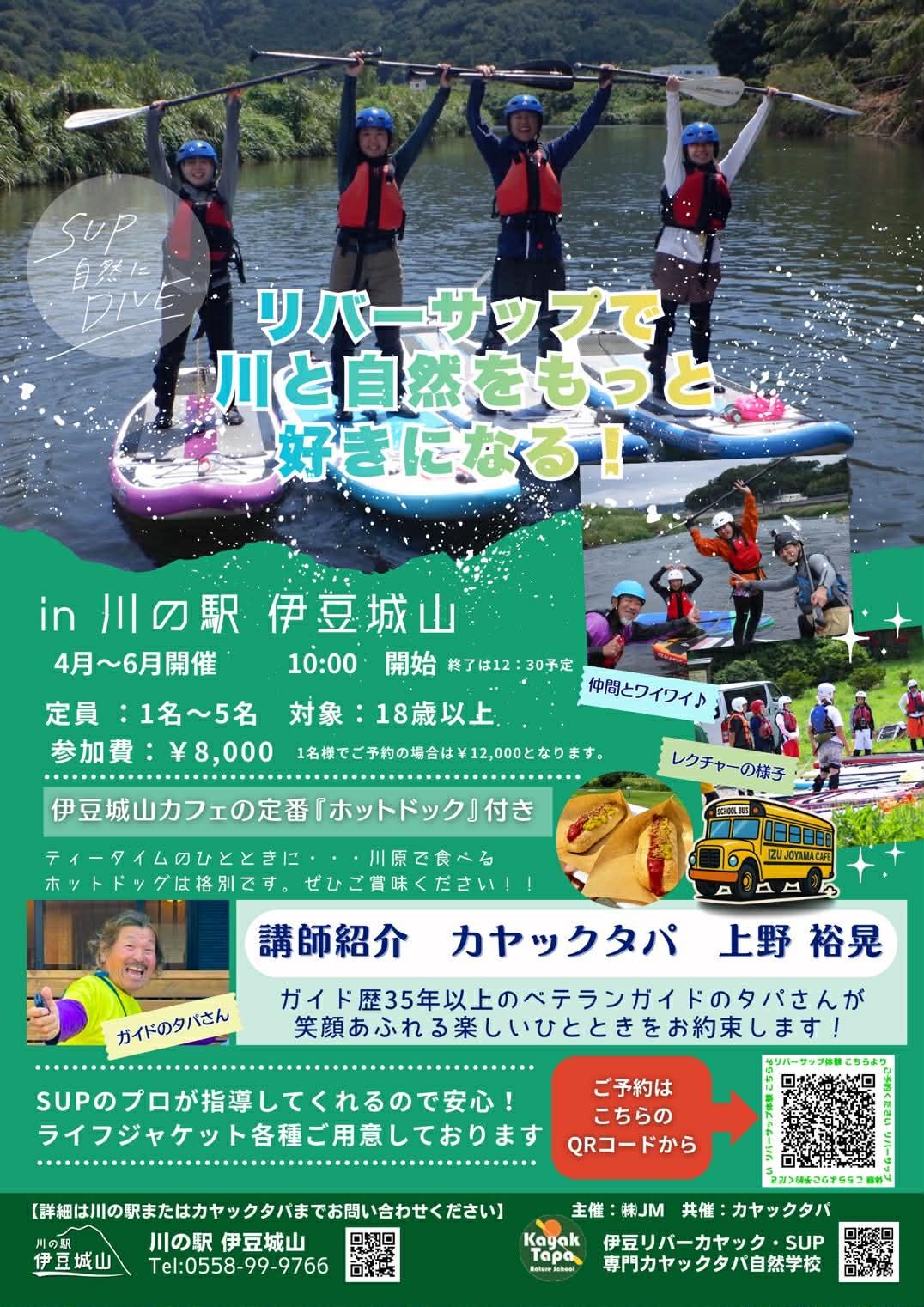 狩野川さくら公園~川の駅伊豆ゲートウェイ函南コース(約5.5キロ) ▼大人(中学生以上) 8,500円(税込) ▼子供 7,500円(税込) ※カヤックは小学3年生以上・SUPは5年生以上(150cm)から可能です ※子供だけの参加はできません ※妊娠中の方は参加できません ※飲酒をされている方の参加はできません ※料金には保険料も含まれています ※わんちゃんは川の駅のイベント「わんことカヤック」(不定期開催)でのみ受け付けます。 |